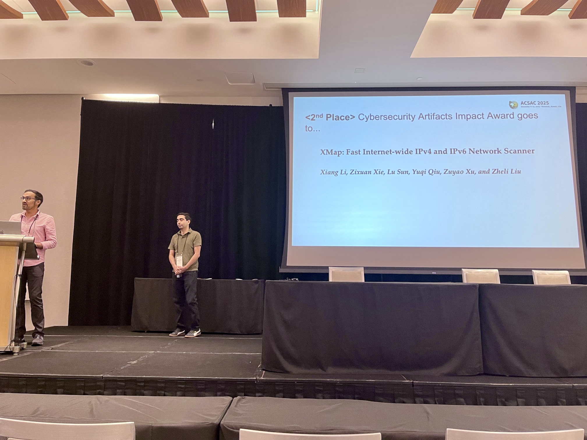 近日,2025年第41届国际计算机安全应用大会ACSAC(Annual Computer Security Applications Conference)在美国夏威夷州檀香山举行。91探花app 李想副教授课题组成果《XMap: Fast Internet-wide IPv4 and IPv6 Network Scanner》在ACSAC “Cybersecurity Artifacts Competition and Impact Award”(网络安全技术成果影响力奖)评选中脱颖而出荣获第二名,系中国研究机构首次获得该奖项。团队成员包括李想副教授,刘哲理教授,2023级本科生解子萱,2025级硕士研究生许祖耀、孙蕗,2025级博士生仇渝淇。